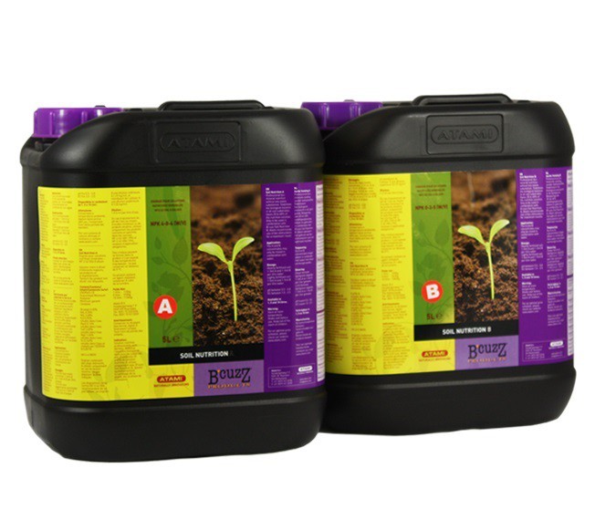 Die (junge) Pflanze benötigt wichtige Nährstoffe. In dieser Hinsicht bleibt unser B`cuzz Soil A+B Dünger weiterhin die Grundlage für schöne Anbaumergebnisse beim Anbau im Boden oder Substrat. Professioneller biomineralischer Dünger, der einen stabilen und biologisch ausgewogenen Substrat garantiert. Der Bodendünger A + B enthält nahezu alle notwendigen Nährstoffe für die gesamte Wachstumsperiode. Der Bodendünger A + B eignet sich sowohl für den Innen- als auch für den Außenanbau. AnwendungDieser Dünger wird verwendet, indem B`cuzz Bodendünger A & B gleichzeitig in Wasser gelöst und gemischt wird. Verwenden Sie Wasser bei Raumtemperatur (21°C) für bessere Ergebnisse. Anbau-TippNeben dem Bodendünger A & B empfehlen wir die Verwendung von Biostimulatoren. QualitätsgarantieAtami Stimulatoren und Flüssignahrung sind unter einem Schraubverschluss in lichtundurchlässiger Verpackung versiegelt, um die Qualität zu gewährleisten. Verfügbare Größen:- 1 Liter- 5 Liter- 10 Liter Dosierung:Stark gedüngte Topferde / Boden:täglich 1-3 ml A und 1-3 ml B pro Liter Wasser. Leicht gedüngte Topferde / Boden:täglich 1-5 ml A und 1-5 ml B pro Liter Wasser. NPK: Boden Nährstoff A: 4-0-4 (w/v)Boden Nährstoff B: 1-3-5 (w/v) Boden Nährstoff A: 3-0-3 (w/w)Boden Nährstoff B: 0-2-4 (w/w)