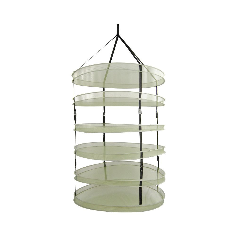 Ein Trocknungsnetz mit 90 cm Durchmesser dient zur luftgestützten Trocknung von Pflanzenmaterial, Kräutern, Blüten oder ähnlichen Materialien. Durch die vertikale Bauweise mit mehreren Ebenen kann eine größere Menge Material auf begrenztem Raum verteilt werden. Das Netz wird üblicherweise in Innenräumen, Trockenräumen, Schränken oder Gewächshäusern eingesetzt.